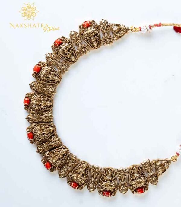 Iconic Temple Detailing: The choker is crafted with a continuous series of ornate panels, each featuring a beautifully sculpted deity figure (most likely Goddess Lakshmi) in a seated or standing posture. The dark, textured antique gold-tone finish provides a dramatic contrast to the bright, warm coral-red stones (or similar deep red accents) embedded between the motifs, making the piece visually arresting.
