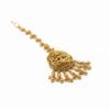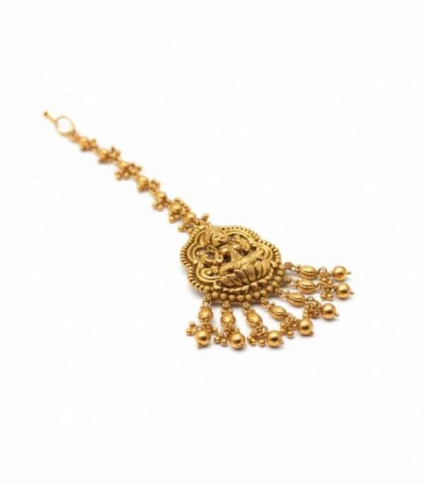 A traditional Indian Maang Tikka featuring an antique matte gold finish. The centerpiece depicts a deity figure, likely a goddess, and is accented with multiple drops of small, intricate gold bead clusters.