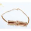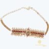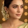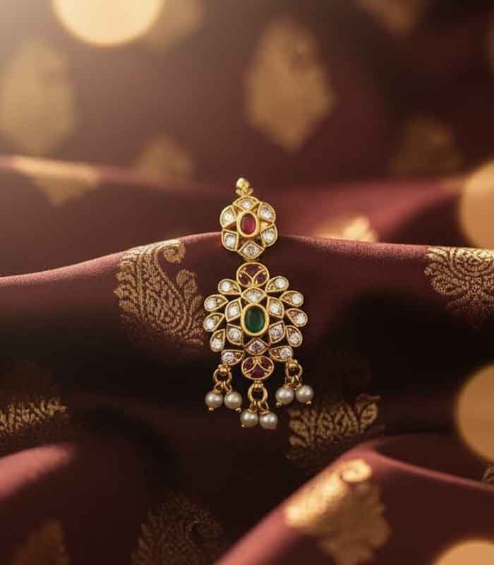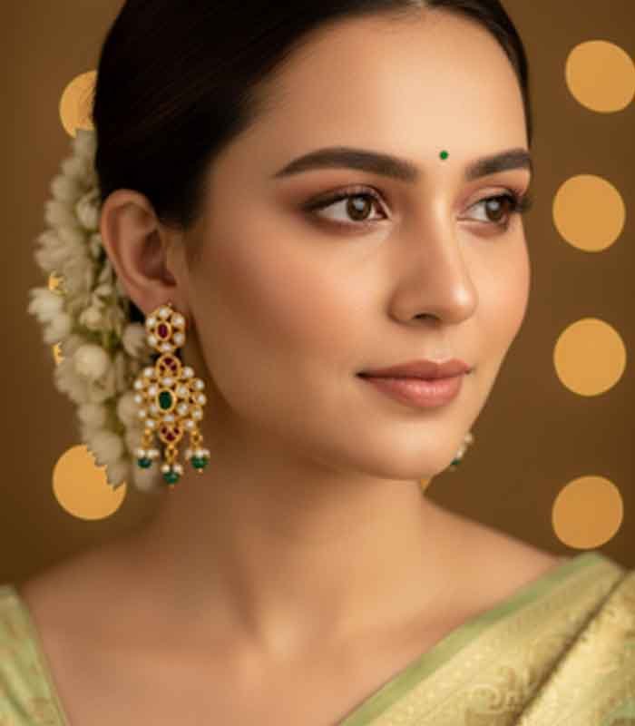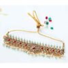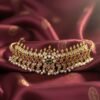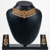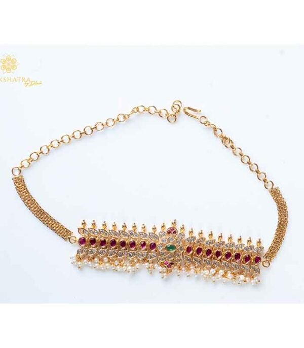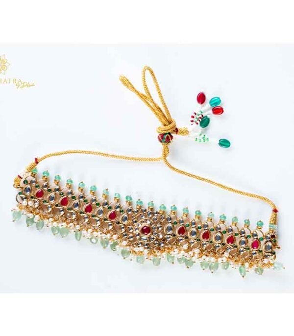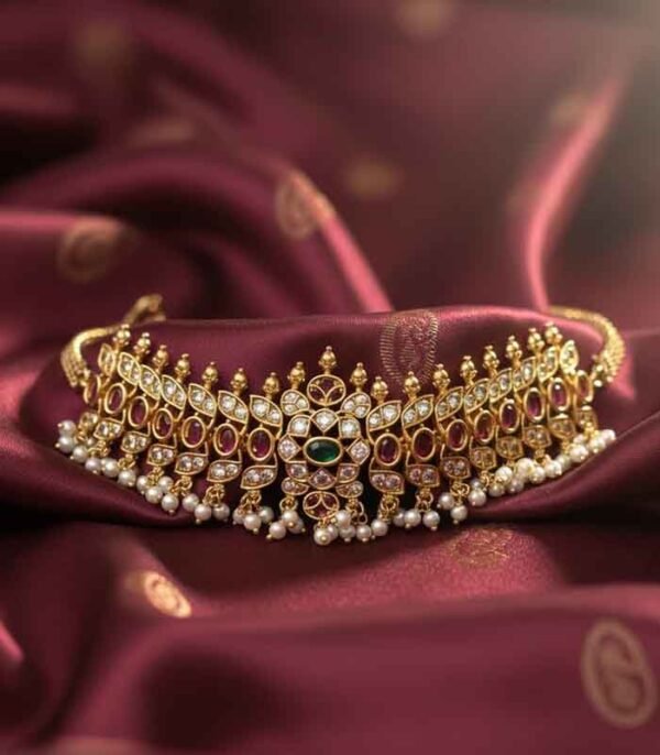 This exquisite traditional choker set is crafted in a gold-look finish, adorned with rich ruby-red and emerald-green stones, accented by sparkling white stones. The intricate floral and temple-inspired motifs are beautifully complemented by delicate pearl hangings, adding grace and elegance. Perfect for weddings, festive occasions, and cultural celebrations, this set comes with matching long earrings to complete the regal look.