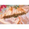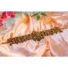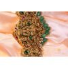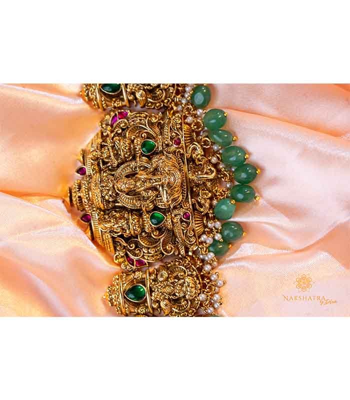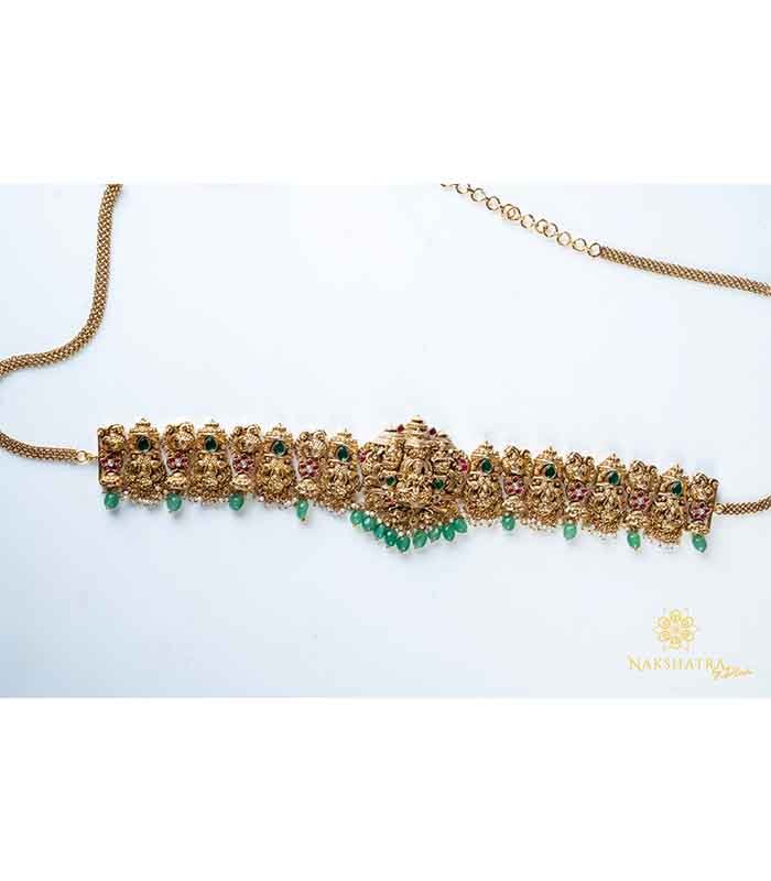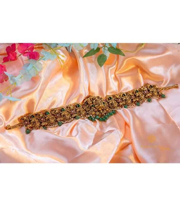 This ornate waist belt features intricately carved depictions of Goddess Lakshmi and celestial figures, celebrating the richness of South Indian heritage. Accented with emerald green drops and ruby-hued stones, this piece adds grandeur to any bridal or classical attire.