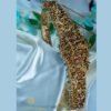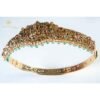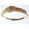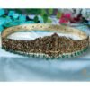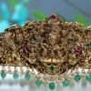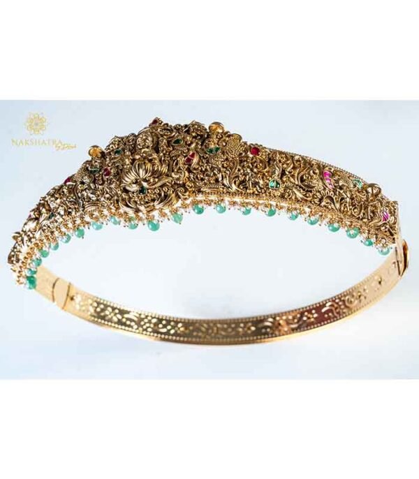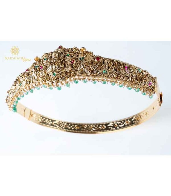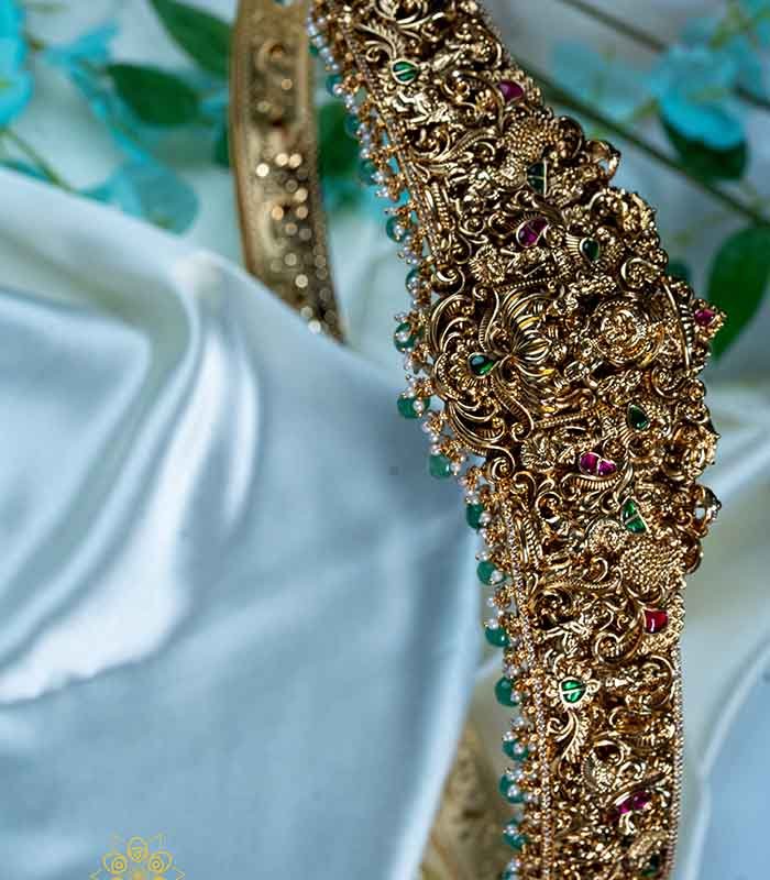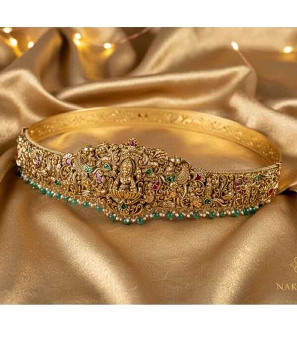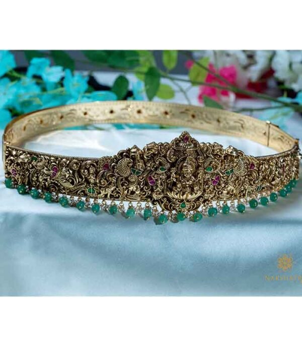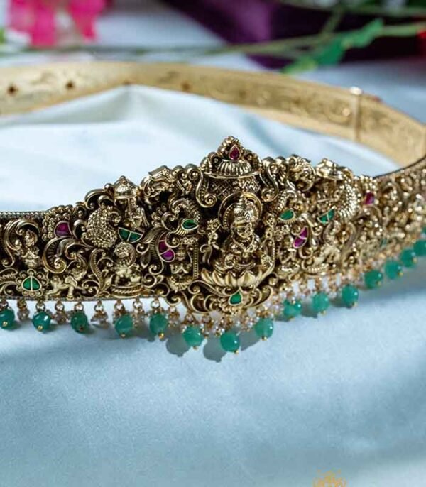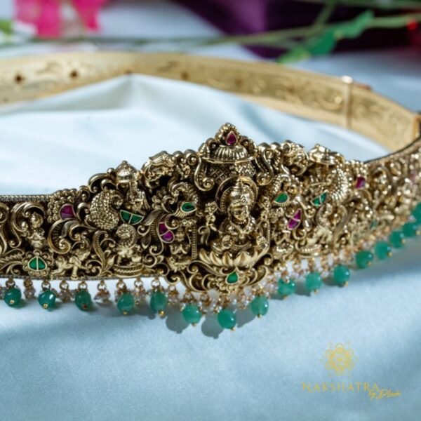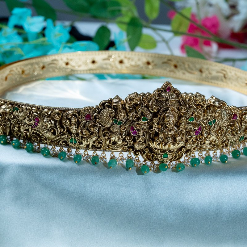 This ornate waist belt features intricately carved depictions of Goddess Lakshmi and celestial figures, celebrating the richness of South Indian heritage. Accented with emerald green drops and ruby-hued stones, this piece adds grandeur to any bridal or classical attire.