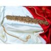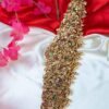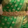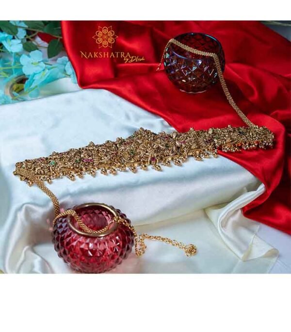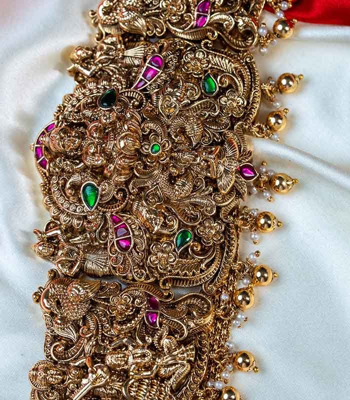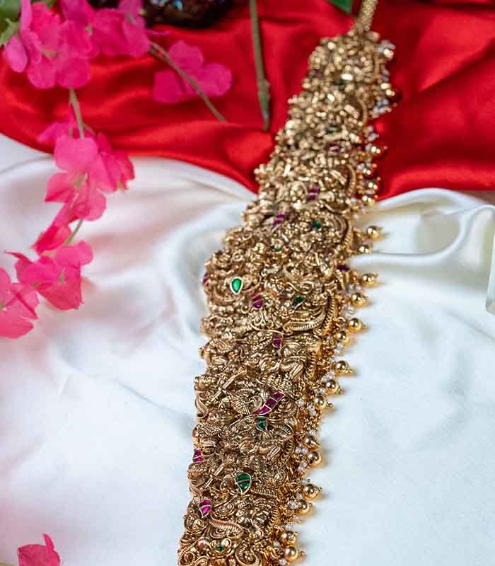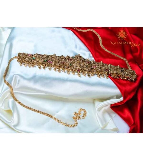 This ornate waist belt features intricately carved depictions of Goddess Lakshmi and celestial figures, celebrating the richness of South Indian heritage. Accented with emerald green drops and ruby-hued stones, this piece adds grandeur to any bridal or classical attire.