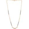 This elegant piece offers a fresh, modern take on the traditional Indian wedding necklace. It features a sleek short length perfect for daily wear or pairing with Western and Indo-Western outfits. The chain is crafted with a combination of classic black beads interspersed with rose-gold-plated links, which are joined by a secure clasp. The main attraction is the finely detailed, floral-shaped pendant, set with brilliant-cut American Diamonds (AD/CZ) that catch the light beautifully. The rose-gold plating gives the piece a chic, contemporary finish, making it an ideal choice for the modern bride who values tradition with a subtle, sophisticated twist.