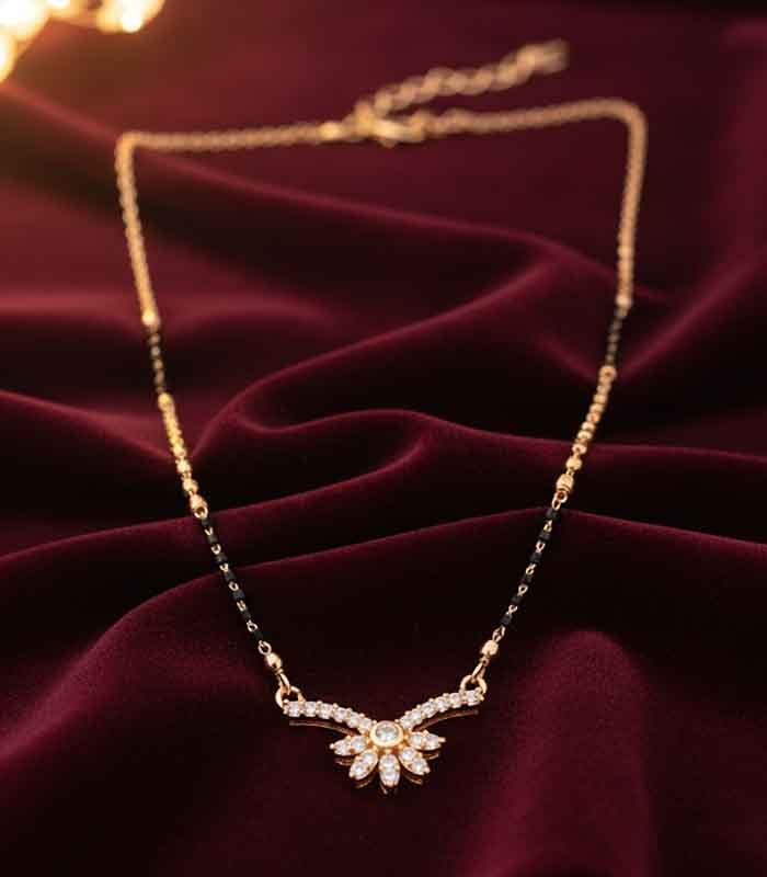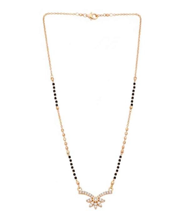 A delicate and modern short mangalsutra featuring a rose-gold plated chain with traditional black beads and a sparkling American Diamond (AD) floral-inspired pendant.