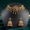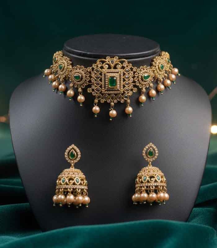 The Complete Ensemble: The set is perfectly complemented by a pair of stunning matching Jhumka (bell-shaped) earrings. These earrings echo the choker’s design, featuring emerald-green accents and a beautiful fringe of coordinating pearl drops, creating a harmonious and truly captivating ensemble.