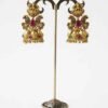 A pair of opulent, traditional Jhumka earrings with a rich antique gold finish. The design features the goddess Lakshmi and peacock motifs, heavily embellished with vibrant ruby-red and emerald-green cabochon stones.