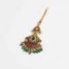 An antique gold-finish Maang Tikka featuring a central emerald-green stone surrounded by intricate work and highlighted with vibrant pink/ruby-colored stones, small clear stones, and multiple dangling green beads and pearls.