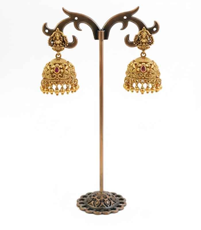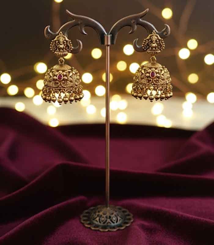 A traditional pair of Jhumka earrings with a rich antique gold finish. The stud features the goddess Lakshmi, and the highly detailed bells are embellished with intricate sculpting, a small ruby-red stone accent, and a fringe of gold bead drops.