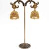 This exquisite pair of Jhumkas (bell-shaped earrings) is a beautiful representation of classic Temple Jewelry. The earrings have a desirable matte or oxidized gold finish, giving them a rich, heritage appeal.