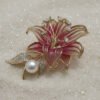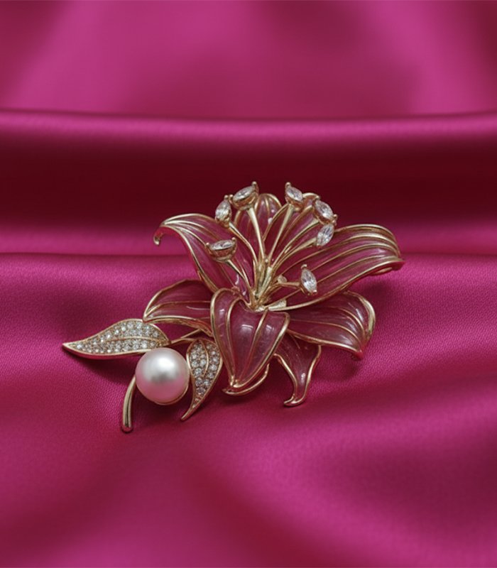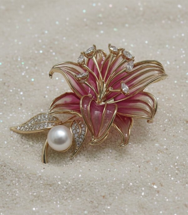 This captivating piece is a luxurious representation of a fully bloomed lily. The flower’s petals are outlined in polished gold-tone metal, with the internal sections filled with a shimmering, translucent enamel that beautifully blends shades of deep pink and delicate white, creating a realistic, gradient effect.
