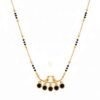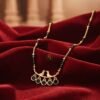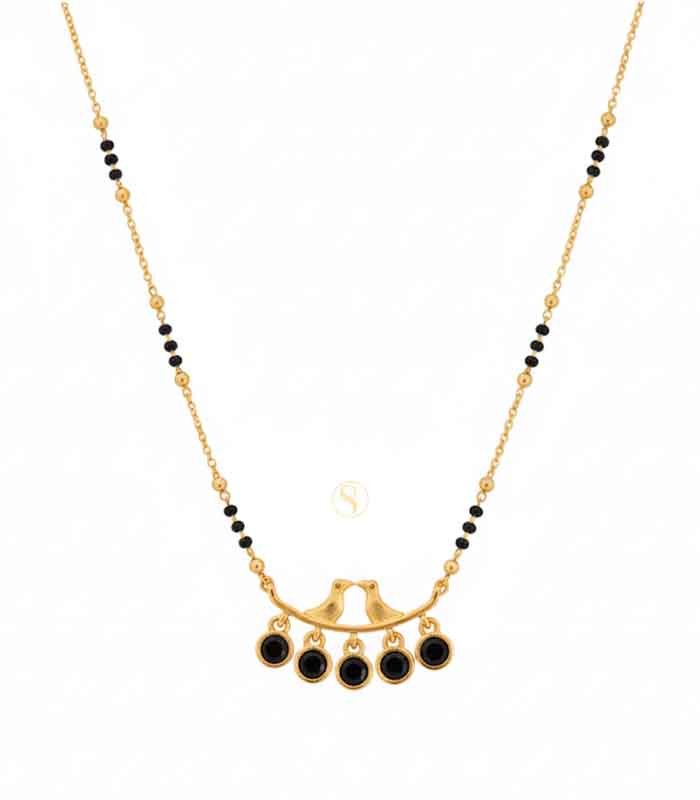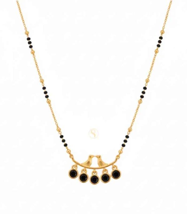 Celebrate your bond with this uniquely designed Mangalsutra, which beautifully symbolizes companionship and marital love with its central Love Birds motif. The necklace features a delicate, short-length chain that alternates between classic gold-tone beads and the auspicious black beads (nallapusalu). The minimalist pendant bar showcases two stylized birds perched together, symbolizing the couple. Dangling below the bar are five striking black round stones (possibly onyx or black crystal), which provide a modern and eye-catching contrast to the gold finish. This piece is perfect for the bride who prefers a meaningful, modern design over traditional stonework, making it ideal for daily wear or pairing with contemporary outfits.
