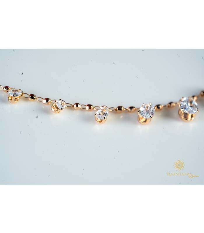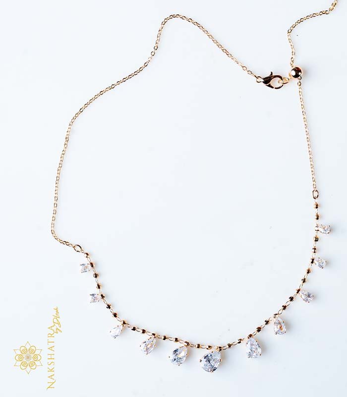 This charming necklace is a delicate and modern piece with a sophisticated rose gold-tone finish. The chain itself is fine and subtle, designed in a station style, where the clear, brilliant-cut stones are set directly into the chain at regular intervals.
