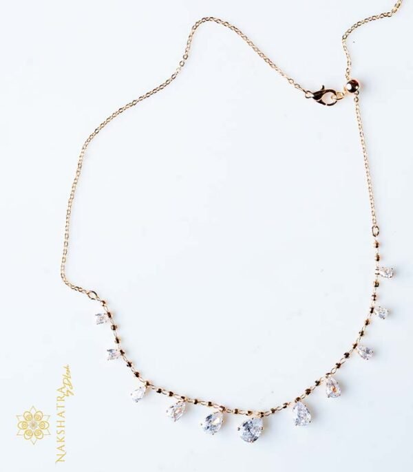 A delicate women’s choker or necklace featuring a rose gold-tone chain interspersed with small, brilliant-cut clear stones set in alternating heart-shaped and round bezels.