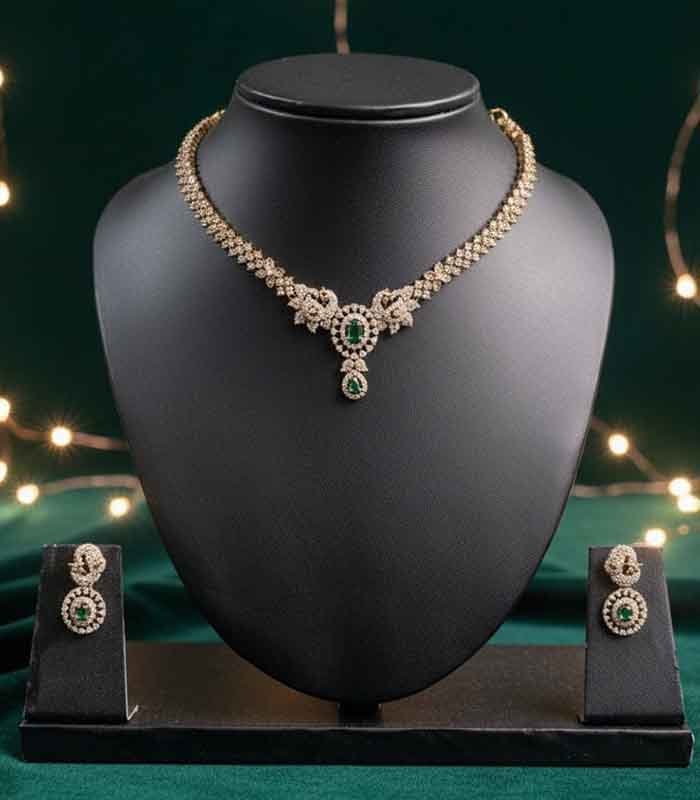 The Complete Ensemble: The set is perfectly complemented by a pair of stunning matching Jhumka (bell-shaped) earrings. These earrings echo the choker’s design, featuring emerald-green accents and a beautiful fringe of coordinating pearl drops, creating a harmonious and truly captivating ensemble.