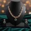 The Complete Ensemble: The set is perfectly complemented by a pair of stunning matching Jhumka (bell-shaped) earrings. These earrings echo the choker’s design, featuring emerald-green accents and a beautiful fringe of coordinating pearl drops, creating a harmonious and truly captivating ensemble.