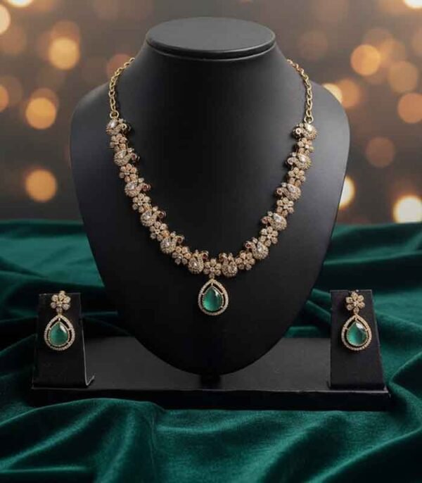 Exquisite Design & Craftsmanship: The choker necklace is a masterpiece of detail, featuring a prominent, rectangular emerald-green stone at its center, surrounded by finely set smaller green stones and delicate filigree work. The antique gold-tone finish gives the piece a treasured, vintage look, highlighting every intricate curve and pattern. A lavish cascade of lustrous, champagne-hued pearl drops adds a soft, ethereal shimmer and elegant movement to the entire choker.